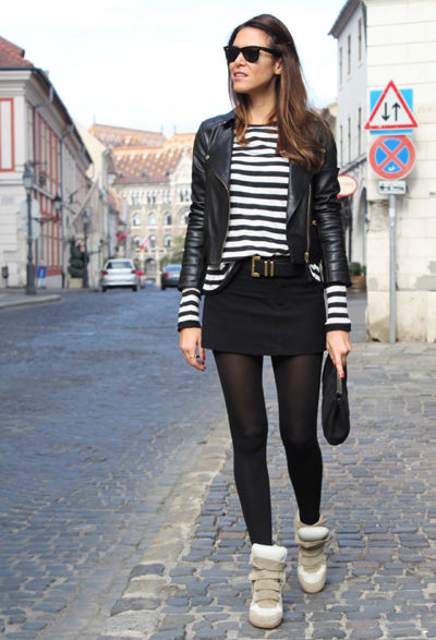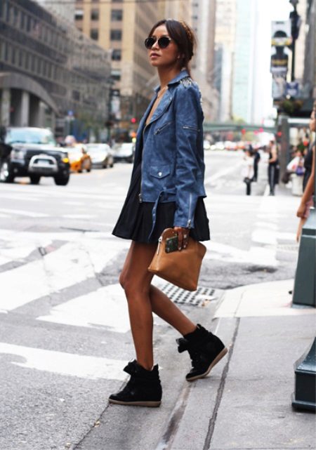 - A light black mini-dress with a free bottom cut sun blends perfectly with a blue leather jacket, which imitates the look of "boiled" jeans.
