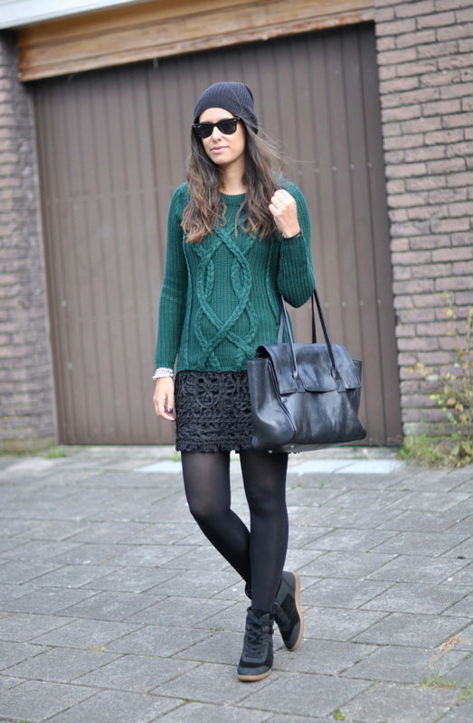 - A black skirt made of thick, coarse lace looks very unusual, which is perfectly combined with a thin dark green sweater, which also has a decor in the form of knitted braids.