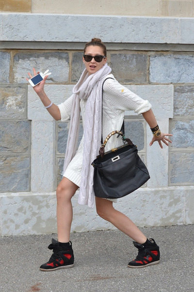 - Tenderness and comfort are combined in this image, consisting of a white denim mini-skirt, complemented by a free-style sweater, which is decorated with small shiny particles - sequins. The image is complemented by a large black-brown bag and golden accessories on hand.