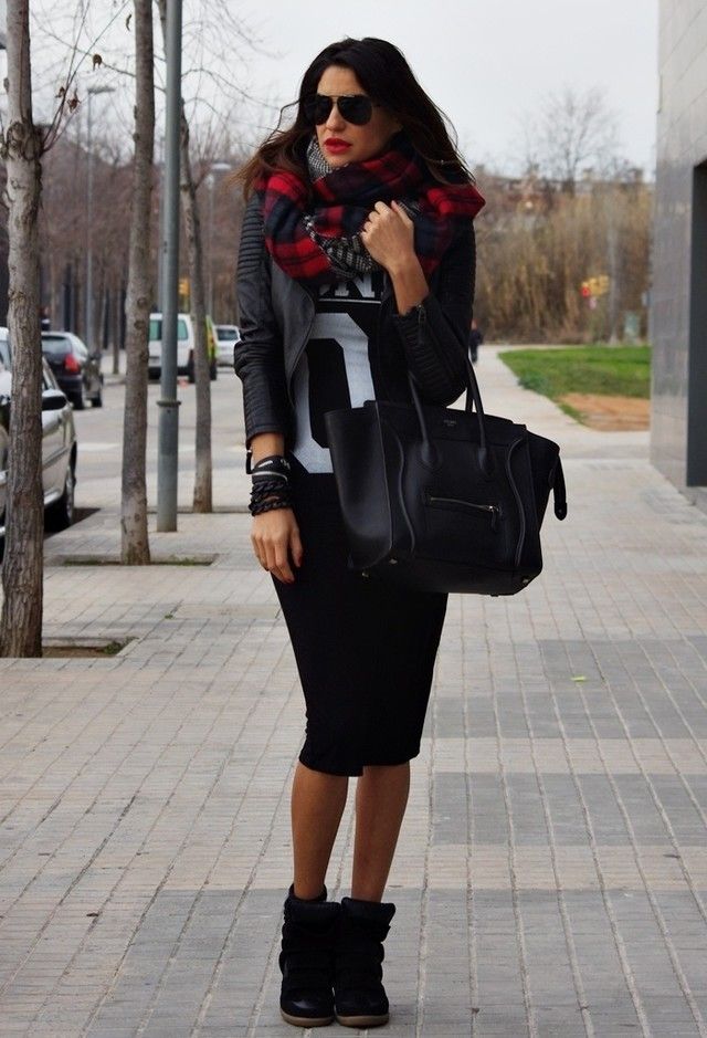 - The combination of a black skirt - a pencil, the length of which covers the knees, a black T-shirt with a white print and a shortened leather jacket, complemented by a stylish bright scarf of red and green tones, looks quite successful.