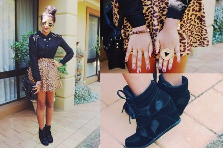 - A very bright and stylish outfit is obtained by combining an unusual black blouse made of thick chiffon, the front part of which has decorative cutouts, with a leopard miniskirt cut to a half sun.