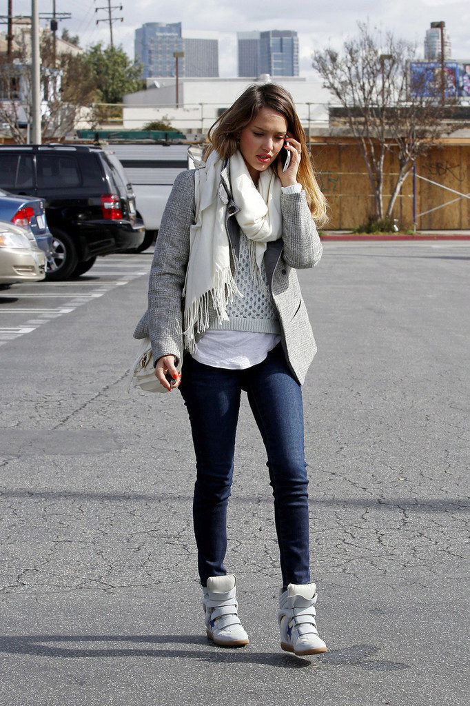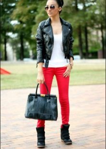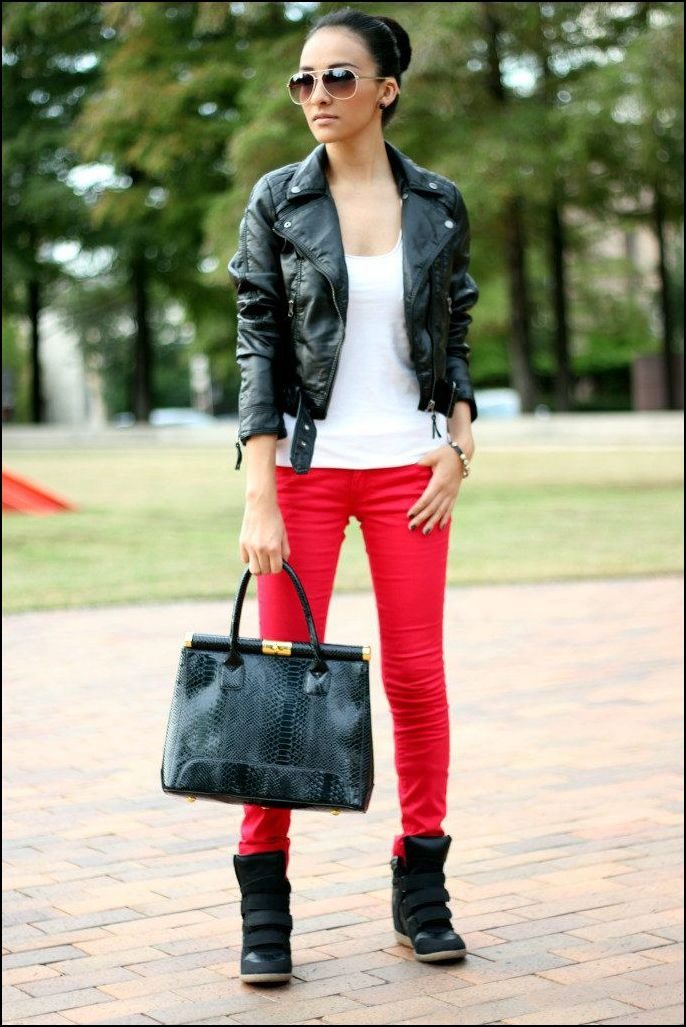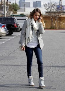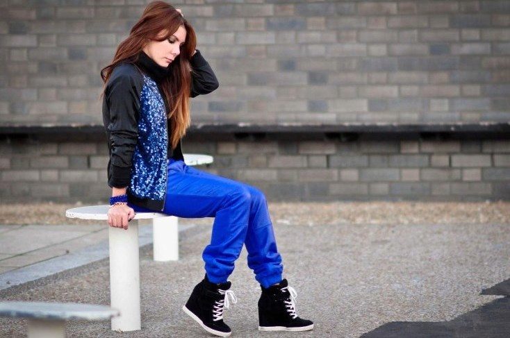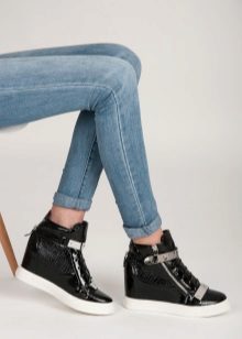 Sneaker boots are perfectly combined with tight-fitting trousers or jeans. Such a duet will definitely make you slimmer by adding height. However, if you put on shortened pants, the effect will be reversed - the silhouette will visually decrease. Curvy ladies can complement sneakers with a free bottom with a shirt or blouse.