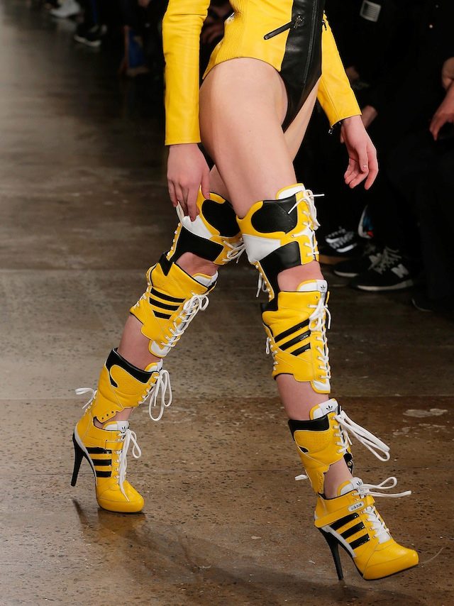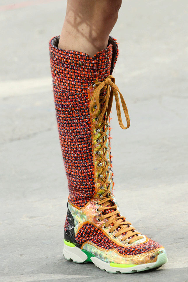 Sneaker boots are decorated with lightning and other metal fittings, rhinestones, and embroidery.