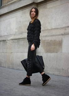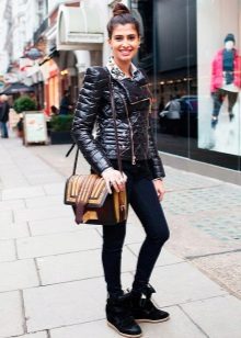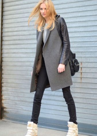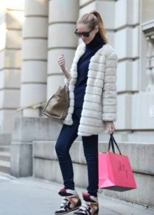 Winter models of sneakers can be worn with different outerwear - coats, sheepskin coats or down jackets, but their length should reach the middle of the thighs. Effectively and charmingly looks short fur coat from expensive fur in the ensemble with comfortable and feminine sneakers. Do not forget about parks or leather jackets.
