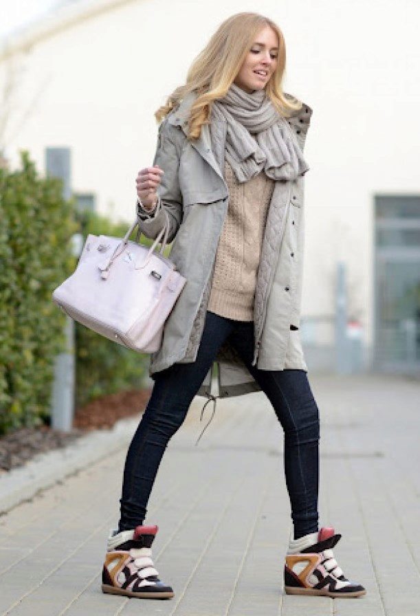 The most successful combination will be fashionable sneakers with an attractive warm dress or sweater dress. They can be worn on tight tights in an ensemble with a warm dress made of knitwear. Stylish combination of sweaters and cardigans with skinny jeans or boyfriends.