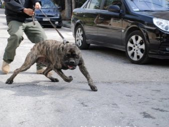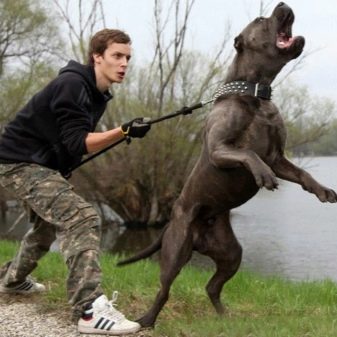 When walking a dog on a chain, the owner must take into account the possible inadequate reaction of the dog to homeless dogs and cats. The animal must obey the person, otherwise it will be impossible to keep him in a fit of rage. It is best to walk in a muzzle bandog.