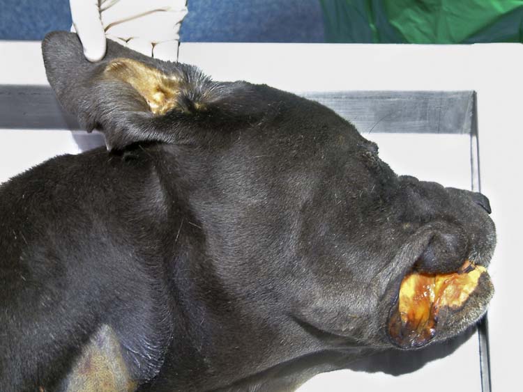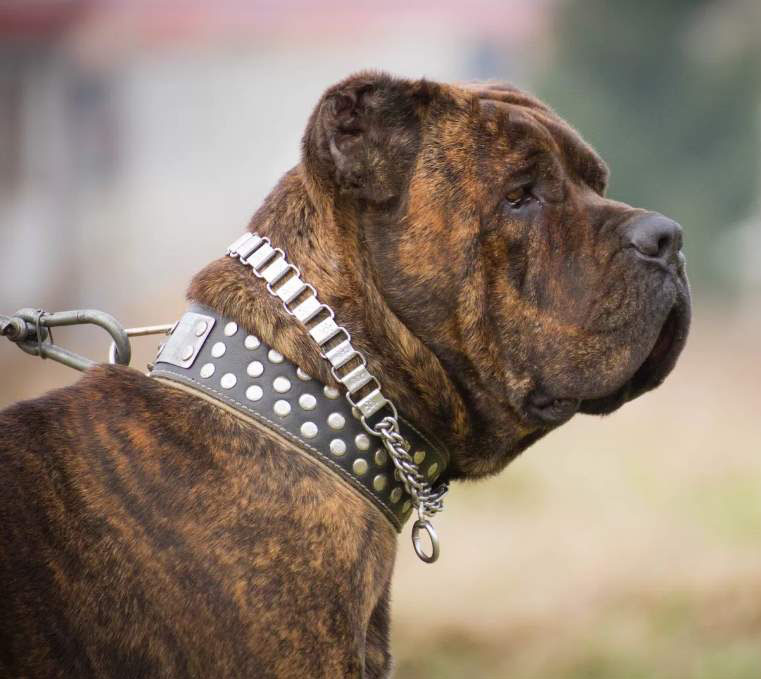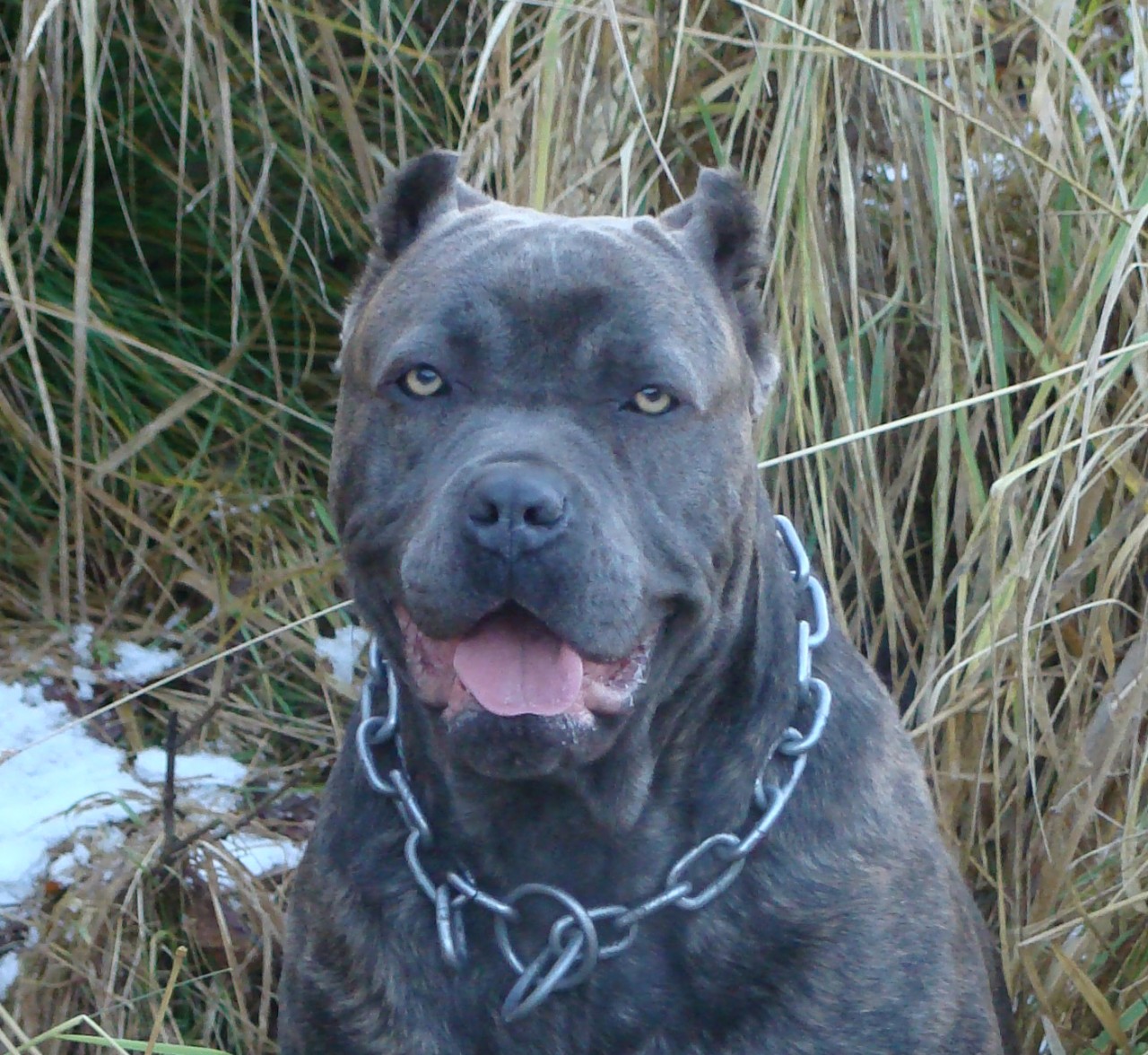 The head of the bandog is large, the forehead is not wide, rather the average size. The muzzle is not narrowed to the nose, but elongated, the nose is large, fleshy, black. The eyes on the big head seem small, slightly slanting. From the outside, it seems that the dog always looks at the person wary. The color of the iris is dark brown.