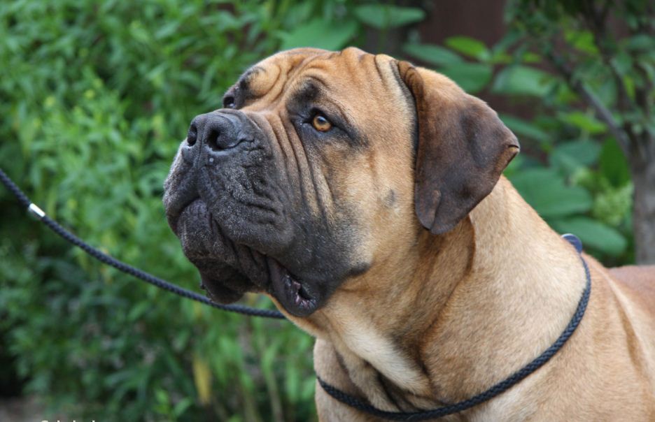 The frontal bones of the Boerboel are wide, in the center there is a groove of a small depth. On the nose there are skin folds, the whole face has a clear muscular relief. The muzzle of the dog is wide, but by the end of the nose it becomes narrower. The lips are characterized by fleshyness, dryness. Dog jaws are characterized by power, strength, grip strength.