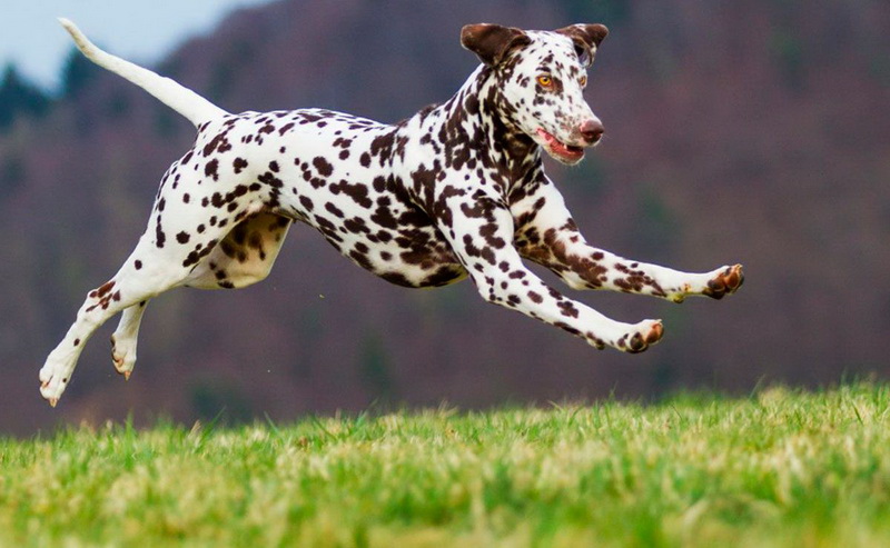 These cute dogs are also very fast, their maximum speed is 60 km / h. Dalmatians differ from other breeds in spectacular color: white short hair is abundantly covered with black or brown spots. The dogs are quite tall, with withers reaching 60 cm. Their character is independent, but friendly and fun.