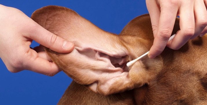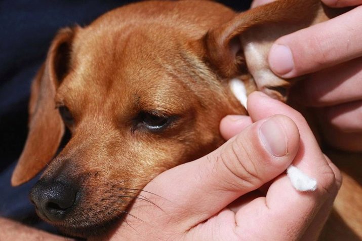 - after preliminary examination and approval of the veterinarian, a solution is poured into the ear to soften too dense sulfur deposits; after that, you need to wait until the solution soaks the sulfur, after which you need to rub the doggie's ear in a few minutes with massage movements; The dirt coming out of the ear afterwards is collected with a wet napkin.