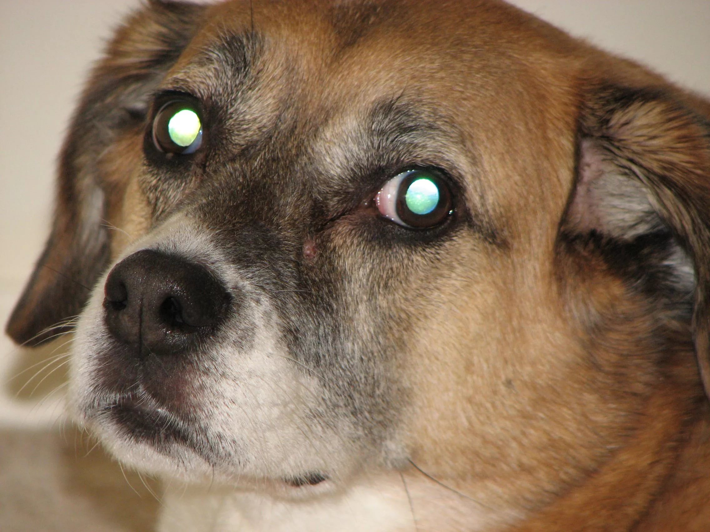 The reason for this is, again, a reflective membrane, thanks to which dogs are so well oriented in the dark. The color of the glow can be yellowish, as well as with green and brown-brown shades. Or combine several colors at once: at the top yellow or green, at the bottom - green-blue. This is due to the color of the membrane. In dark-eyed animals it is darker than in breeds with a light iris.
