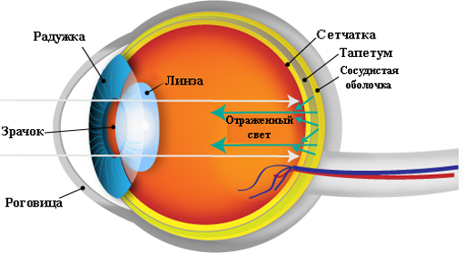It is wonderful to see the tapetum already mentioned in the complete darkness of the dogs. This is a reflective membrane, which is compared with the glow of headlights or specular coating. It is located in the upper part of the retina, responsible for night vision.