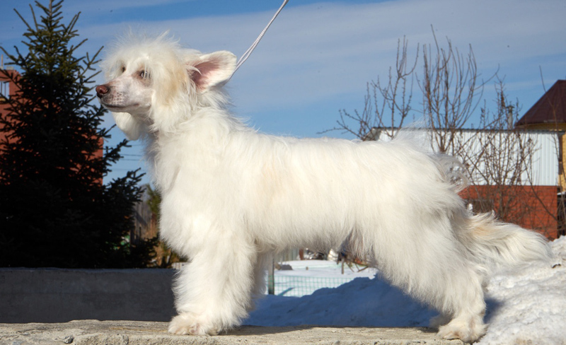 The Chinese crested downy dog has the appearance of a small, elegant creature with an elongated body shape. The height of the animal can be from 25 to 35 centimeters, while they weigh no more than 6000 grams. Dwarf dog is completely covered with long hair that has a flowing character. The fur color of such a pet can be the most diverse, the most common are white, cream, pale gold, black, black and white. Hair puff straight, do not have signs of curly.