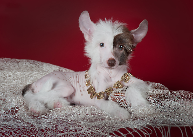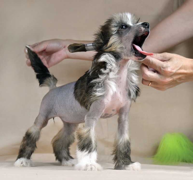 In the period from 1 to 3 months, the exterior of a Chinese crested dog can drastically change. Most often it concerns changes in color or proportions of the head. So, individuals with darker or chocolate wool may eventually acquire almost a snow-white fur coat. At about 3 months the form of the most important external element of this dog - the topknot is fully formed. The length of the head and muzzle in infancy is not worth measuring, it will probably change more than once.