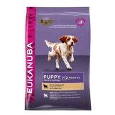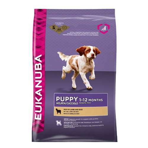 - Foods super premium brand Eukanuba intended for puppies aged 1 to 12 months. The product includes chicken or turkey, as well as rice, wheat and corn. Food is enriched with calcium and prebiotics. There are no flavors or preservatives in the feed.