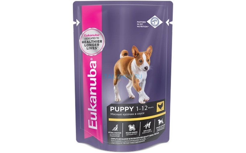 - Canned super-premium Eukanuba. Made from chicken meat and offal with the addition of vegetables. The product is fortified, enriched with plant and animal fats, minerals, fully balanced for puppies feeding.