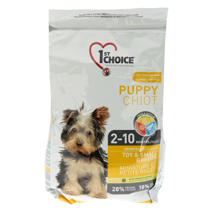 - Brand 1st Choice presents dry food for super premium puppies. The composition of the feed contains natural chicken meat, pearl barley or oatmeal, crushed beets and tomatoes. Pellets intended for feeding puppies are small and enriched with a vitamin complex. A negative factor is that there is salt in the product. The food is intended for puppies aged 2 to 12 months.