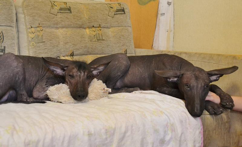 Naked dogs can not be allowed to fight with other dogs, and when the conflict is maturing, you should immediately breed the animals and take them on leashes. This requirement is due to the fact that the bare skin of a Mexican can be damaged in a fight, which will lead to the appearance of ugly scars.