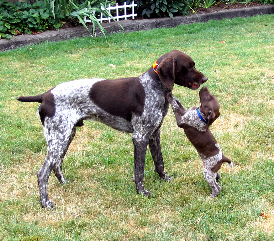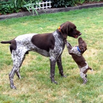 Other pets for the Kurzhaar are also not a problem, unless they are not a badly socialized individual. Dogs of the breed in question do not seek to show their superiority and will not try to occupy the main place in the house. The only exception can be called living together two males, who will growl at each other in an attempt to prove the right to the existing territory.