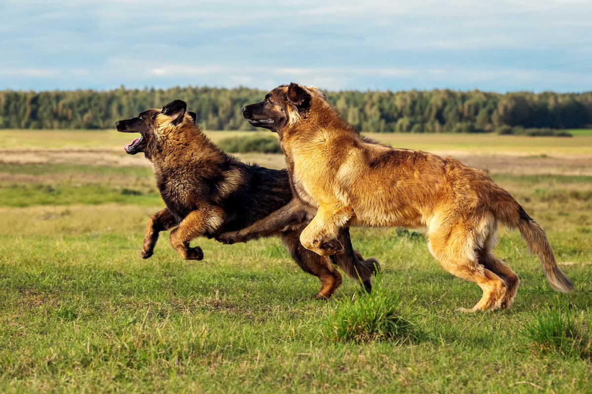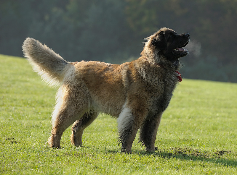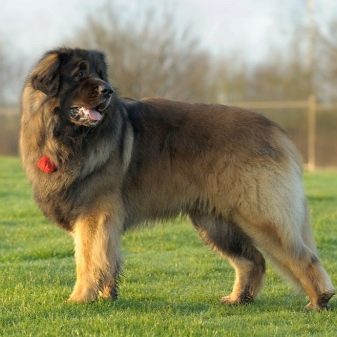 In their constitution, leonbergers are square-format dogs, although they have a slightly elongated body, the length of which corresponds to the height at the withers as 10: 9. The dogs are well-built and have developed muscles, strong bones, a broad and even back, and elastic lower back.The withers are clearly visible, the chest is deep and wide, the belly is tucked up, the neck has no dewlap and looks slightly elongated. The tail of the leonbergers at rest is loose, rather long, and set below the hull line. When the animal is in motion, it rises and bends slightly, but in general it still remains below the back line. The long paws on the erect joints are arranged in parallel, the fingers are collected in a strong lump and have sharp claws.