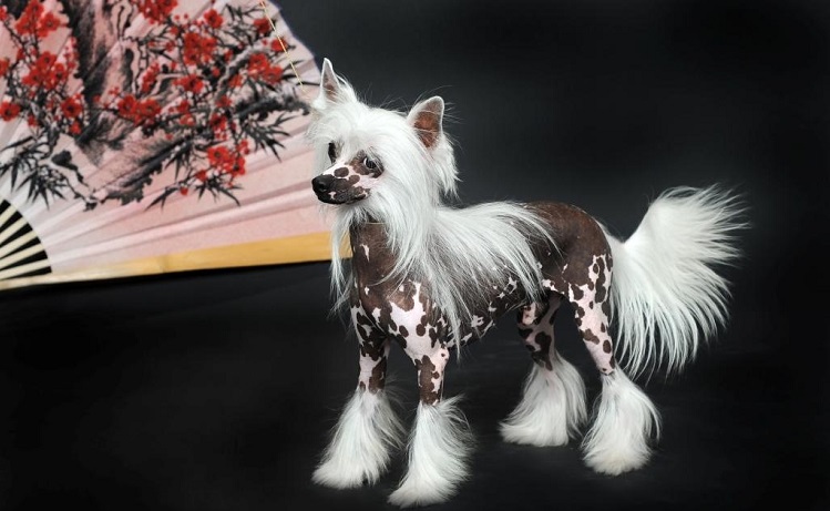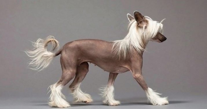 There are bare spotted dogs, black and other colors - there are no restrictions, but blue and marble versions of shades of wool are considered basic. The hair of the Chinese crested in this type of breed can be found only on the head, legs, tip of the tail - it is long, straight, without signs of waviness.