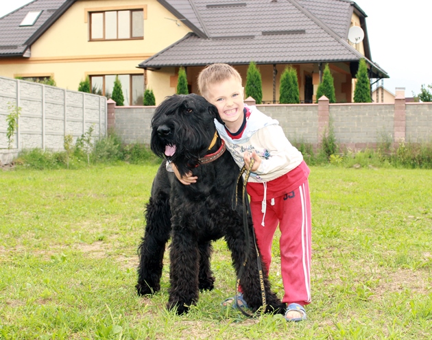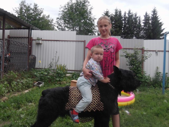 - Attitude to children. In relation to the small members of their family, the rizen are always friendly. They will be happy to take part in any game and venture that kids come up with, as well as guard the owners if the fun goes beyond security. Rizeny does not pay any attention to pestering and negligence, if it does not reach open aggression and teasing. Some breeders say that these dogs are wonderful nannies who not only protect children from trouble, but also protect their sleep, protect them from strangers and street animals.