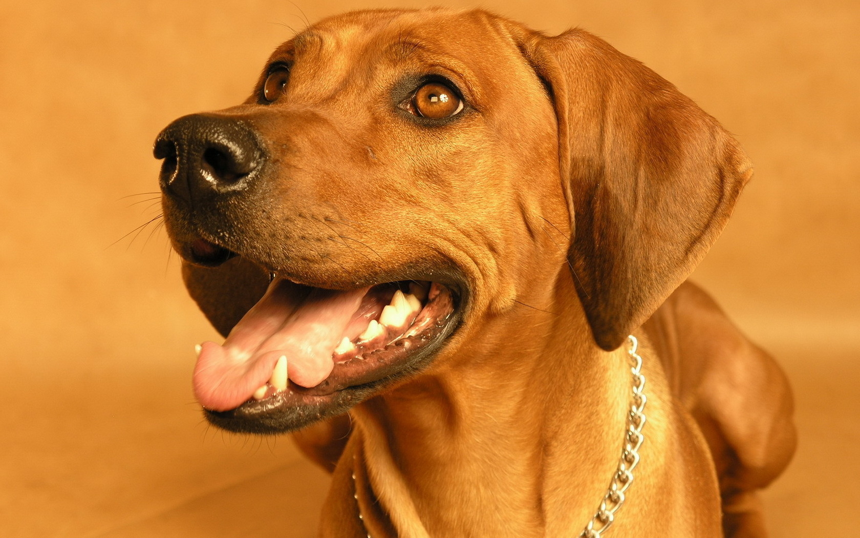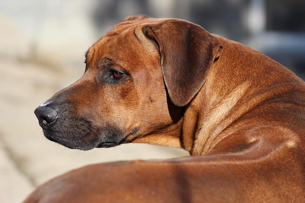 The lips of the ridgeback are thin and neat, they are not sagging and completely cover the teeth, without forming characteristic sagging and folds in the corners. Jaws are very strong, correctly folded, scissor bite, complete dentition. The teeth of the ridgeback are large and powerful (this applies especially to dog canines).
