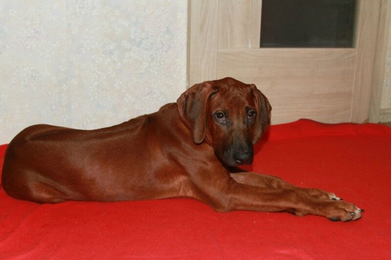 These dogs deftly hunted by a group, they stopped the prey by pack and waited for their owner. That is why the ridgeback was once called the lion dog or Simba-Inya. In our country, these dogs appeared in the early nineties, and a couple of dogs were brought here not from the homeland of animals, but from America. In the first litter that appeared in 1994, 6 puppies were born: 1 male and 5 bitches.
