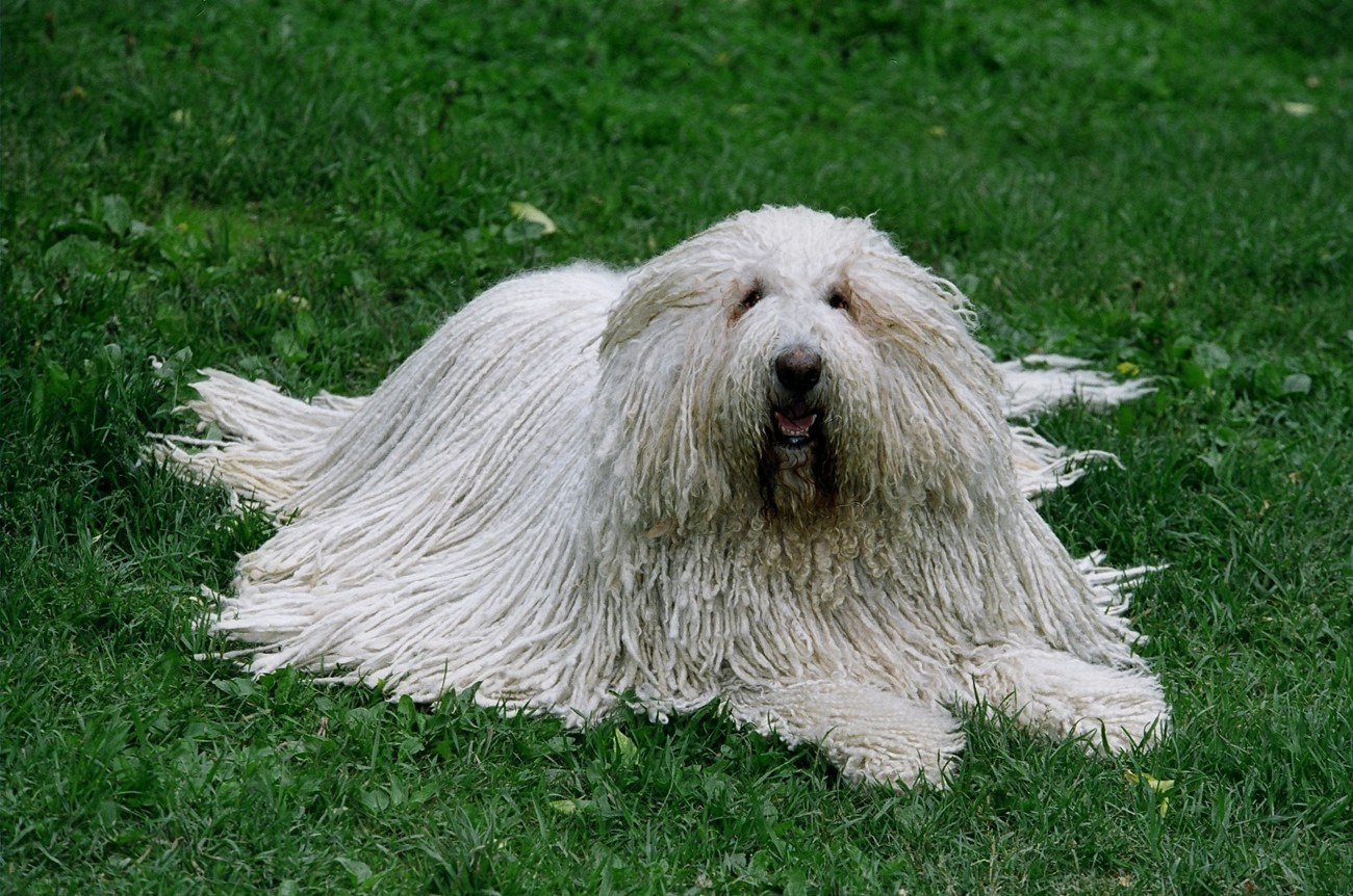 - Komondor or Hungarian Sheepdog. Many consider this dog the most amazing breed. All because of the extraordinary (plush) coat of komondor - their white wool is placed in a dense layer throughout the body in the form of long and thick dreadlocks. In their homeland, the Komondors were used exclusively in guard activities — the white color and the unusual growth of wool allowed these pets to literally merge with the sheep herd and successfully control it.