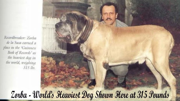 - The biggest dog in the world. Among the breeders of the English Mastiff is known such name as Aikama Zorbo - this is the largest male dog of the English Mastiff in the world, who was rightfully recognized as the largest dog in the world. In the Guinness Book of Records, this dog was recorded with the following parameters: height - 94 centimeters, weight - 155.6 kilograms, length (from nose to tip of tail) - 251 centimeters. Male was born in 1981, his owner was the English breeder Chris Iraklides.