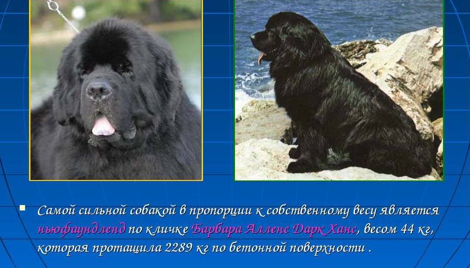 - The strongest dog in the world. It is not for nothing that the opinion that it is the Newfoundlands that are the most powerful and powerful dog breed in the world is popular in the world.This opinion was formed on the basis of the achievement of the bitch of this breed named Barbara Allens Dark Hans. With its low weight (about 45 kg) and a small height this dog managed to drag 2.29 tons of cargo across a concrete surface in 1979.