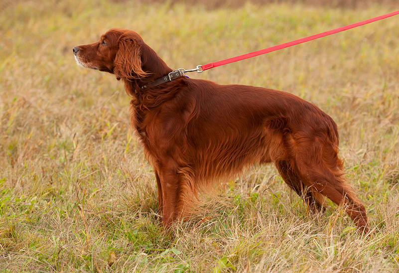 Regardless of color, Irish setters were presented with a certain list of requirements for inclusion in the standard: hard work, lack of fear of water and noise, harmonious small sizes, robust and muscular body, developed senses (especially hearing and scent), thick hair and undercoat.