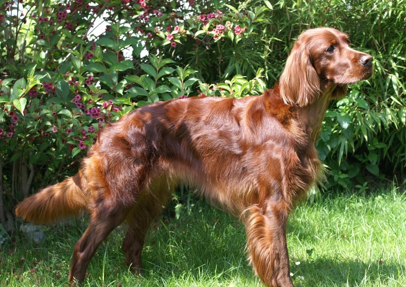 Irish setters appeared much later than other varieties of this breed. It is believed that these dogs are descended from black and white English setters, to which blood was later added to other European hunting dogs: Gordon setter, Bloodhound, Irish water spaniels. The result of this selection was the creation of Irish setters with a red color, but the experiments on the appearance of the dogs did not end there.
