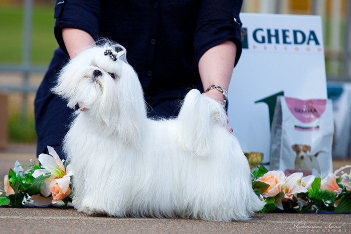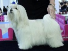 According to the breed standard, the Maltese dog breed for exhibition should be 5-10 cm longer than the length at the withers. When an animal moves, its fur coat flows in a mantle, in a static position it should lie beautifully, forming a clear, graphic silhouette. Properly executed exhibition grooming emphasizes the advantages and well hides the flaws.
