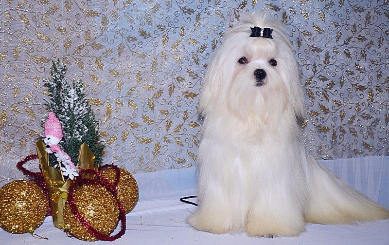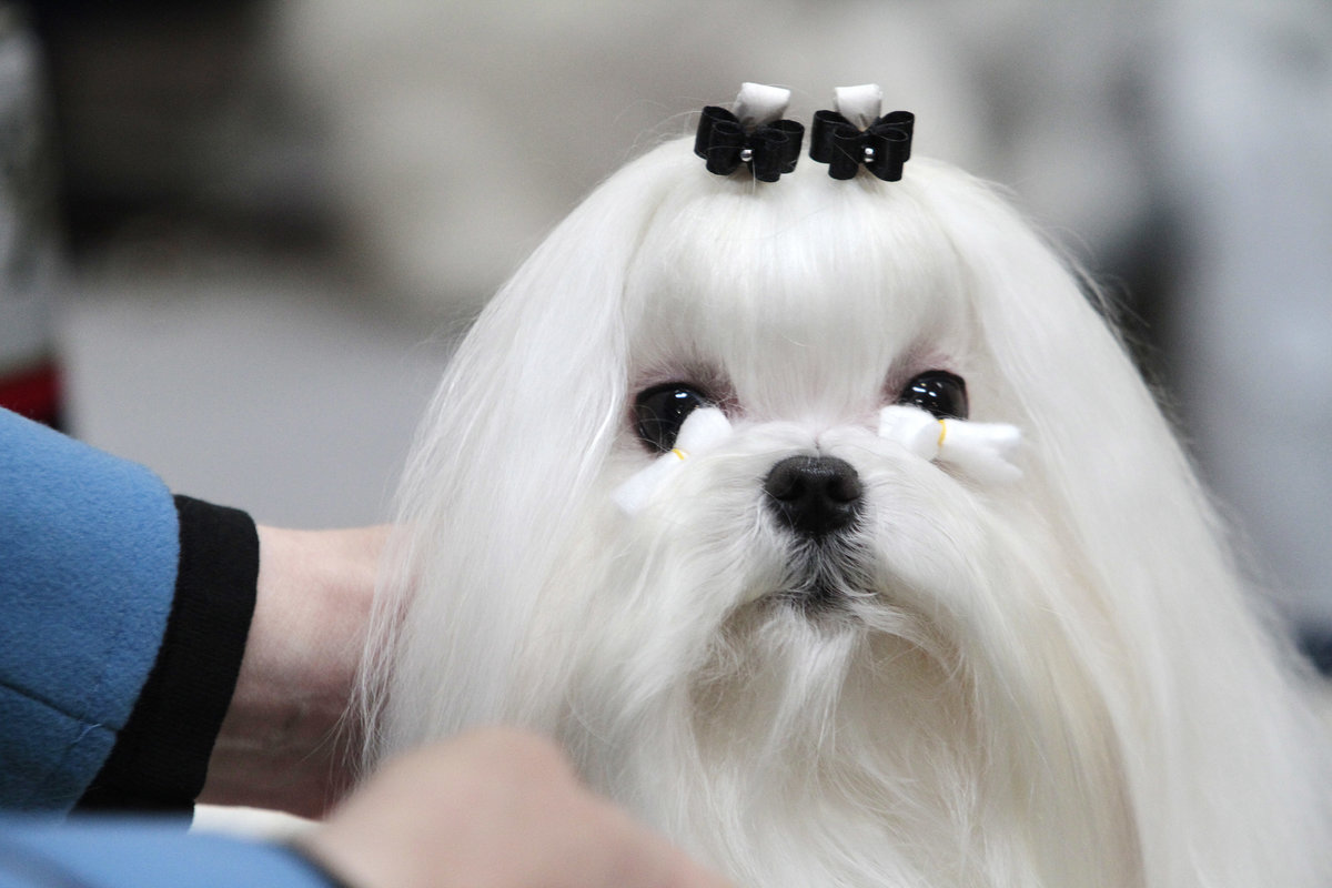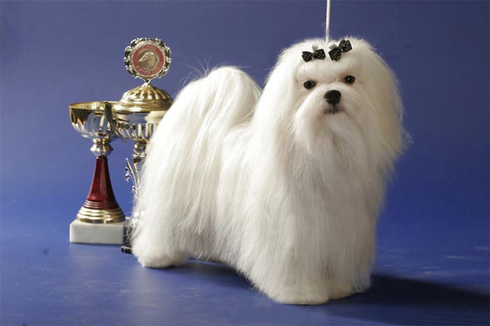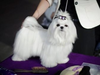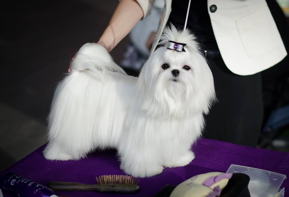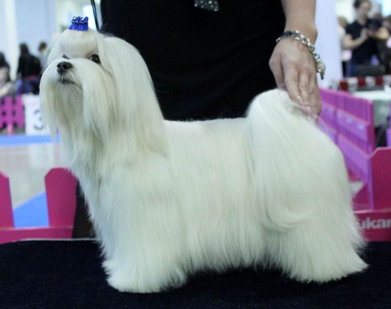Care for maltese wool for an exhibition requires a particularly careful approach to business. The length of the coat should be maximum - 5-10 cm longer than the height of the dog at the withers. The tips of the guard hairs are trimmed to form a beautiful and clear line. Extra pelt is removed on the paw pads, in the anal area. A top note is formed on the head - tails that form a clear and even parting that reaches the croup.