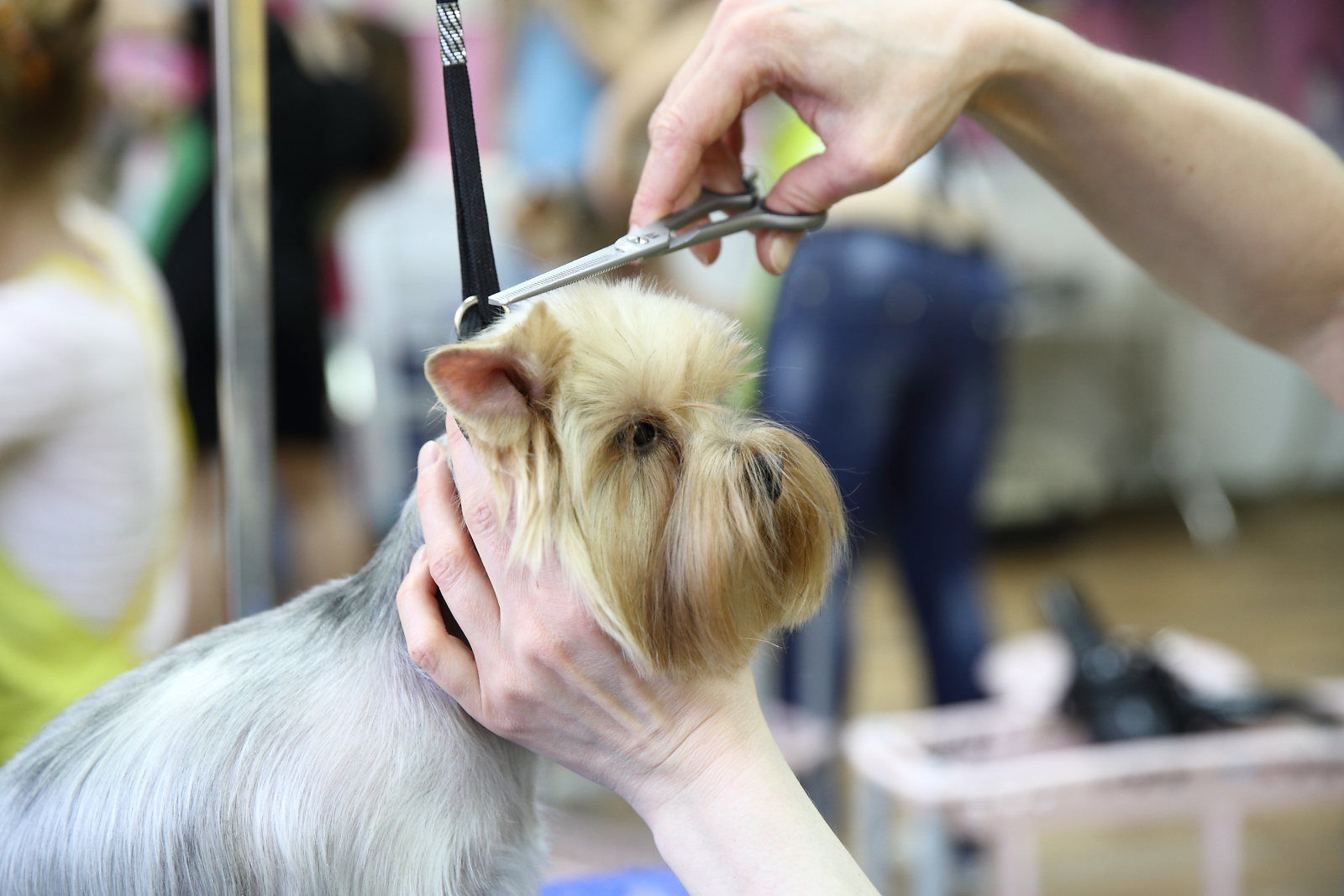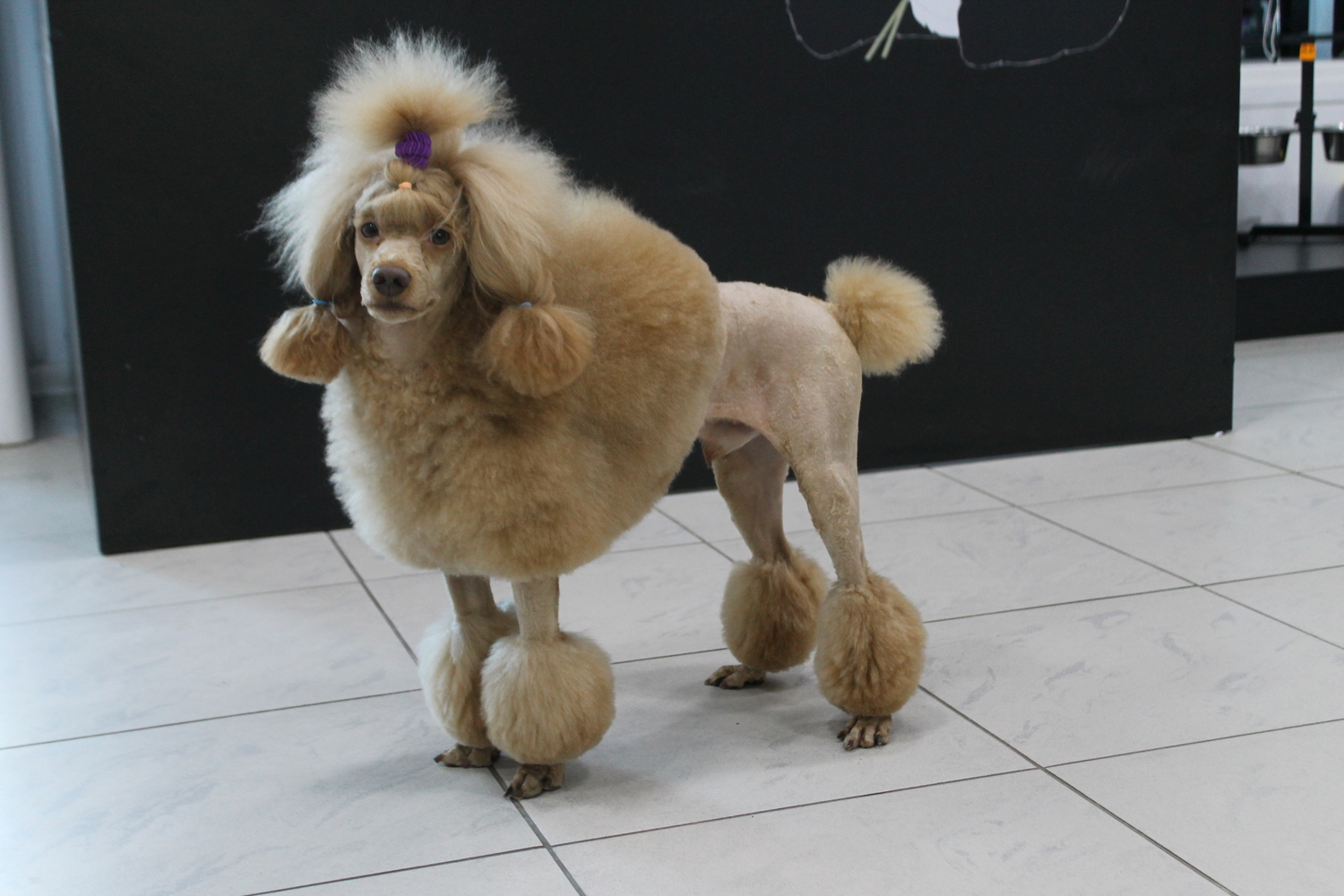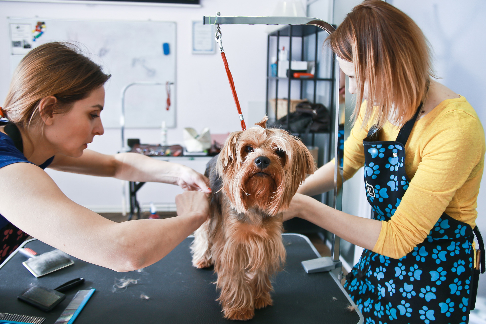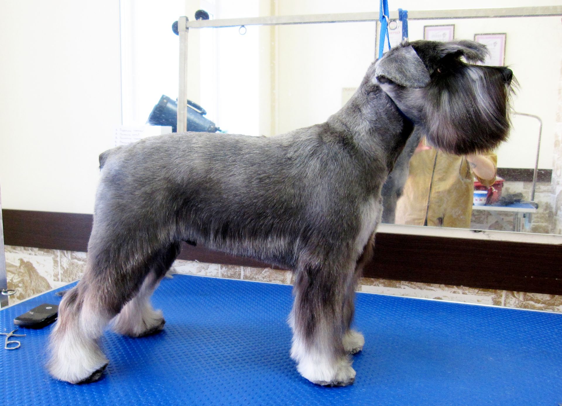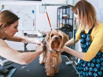 - These salons are equipped with special tables for haircuts. At first put a dog collar on, and then attach it to the bracket. At the same time, it can be adjusted so that the animal is at the required height for the master for more convenient work with his ward.