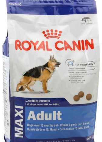 - Royal Canin. This brand is from France. He creates feed with the individual needs of pets. The product range includes offers in two lines: Maxi (26-44 kg) and Giant (over 45 kg). Starter is available - a product for puppies and lactating dogs, separate versions, taking into account pedigree features. The large amount of cereals in the composition, the presence of wheat and soybean oil make this product less useful for dogs than the proposals of the leaders of the rating.