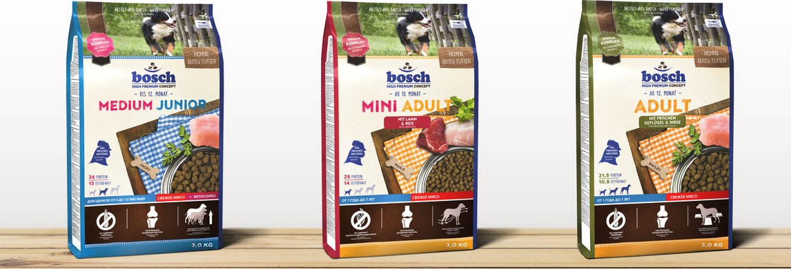 Produced, like the previous one, in Germany. Its advantages include the presence of vegetable protein, various meats, excellent vitamin and mineral components, a huge selection of flavors and combinations of compositions. His search will not take much time, since Bosch is present in abundance on our shelves. But all the advantages are “compensated” by the high price of the product.