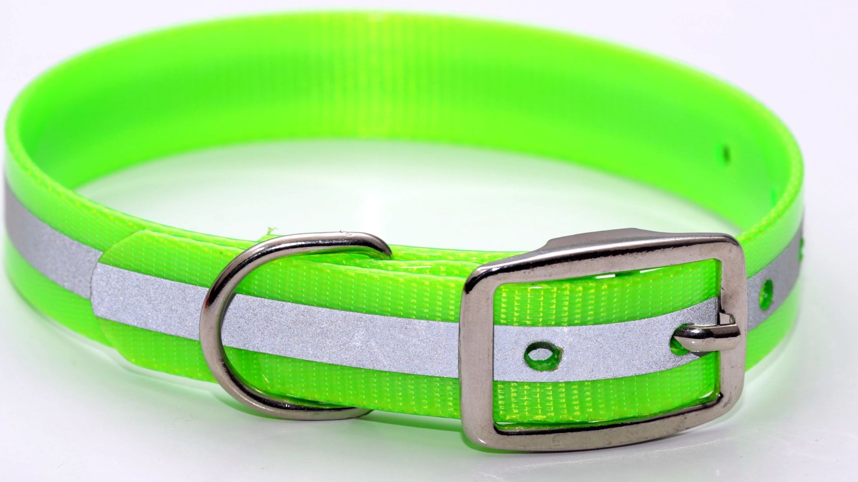 There is one more type of luminous collars, made with the use of special materials that reflect the light falling on them - they are equipped with reflective ribbons along the edge. Such a collar does not help to find a dog in the dark, but can save you from getting under the car.