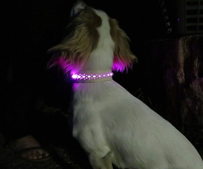 Too bright or blinking light is harmful to dogs: reduced clarity of vision. The dog can be disoriented for the first walk, therefore it is more expedient to use a collar with a nylon ribbon, which partially dims the glow of the diodes. For the same reasons, it is not recommended to use a blinking or flickering mode of operation of a luminous accessory.