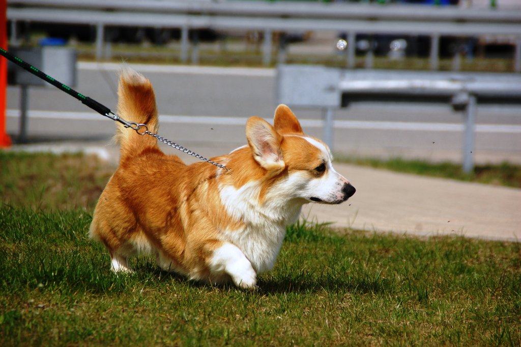 The neck of the Pembroke is moderately long, somewhat curved, dryish, smoothly passing into the shoulders. The standard allows for an insignificant cross-leg behind the withers associated with a difference in length and weight of the coat. The base of the tail is in a single plane with the level of the top line. The body is medium, sternum ovoid, deep. It falls between the forelimbs, the waist is proportional, not short.