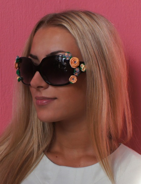For the decoration of sunglasses still use a variety of overhead elements: volumetric applications around the lenses of the glasses, decoupage, rhinestones, stones, beads and much more.