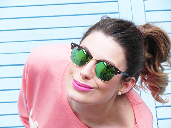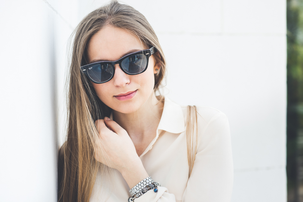 - Set in the urban style with a touch of romance. Here we use the technique we have described above - color accents are placed. The original, fashionable top with a zipper with delicate sleeves has a blue tint in the colors. He picked up the same mirror glasses with blue lenses. The result was a stylish, fresh, feminine and nonbanal onions.