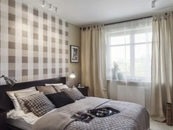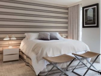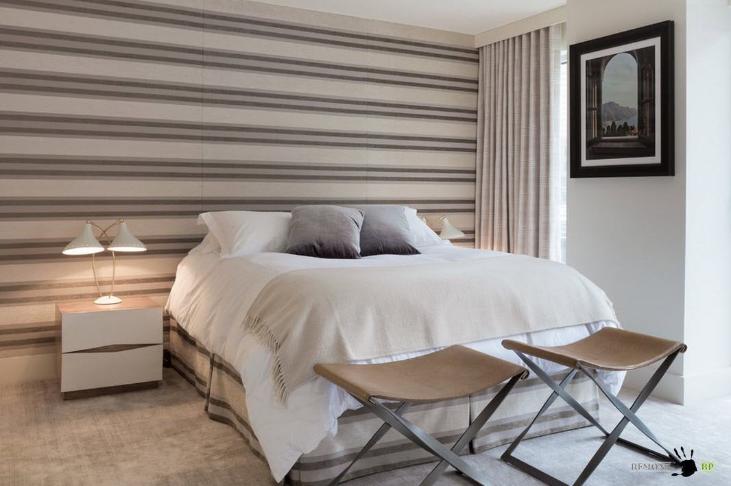 - Cell, strip. Striped variations, characterized by tonality of color, are often a reconciling decision if the debate about the wallpaper in the bedroom are deadlocked. It is difficult to get tired of the strip, it is concise and moderately strict, does not carry any fashionable tasks (which tend to become obsolete, yielding to new trends). The cage is all the same, except that for some reason, the cage is more often preferred by men. Women probably consider it very strict.