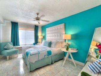 - Turquoise and different shades of blue. For those who dearly love the sea and miss it, such walls can seem like a good investment in a partial visualization of a dream. You will wake up and fall asleep in the color of sea water and clear sky, and the mood itself will rise.Blue and turquoise do have a relaxing, soothing effect.