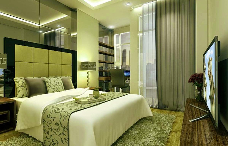 True, in the interior of a bedroom with this color, you need to be careful - on glossy surfaces, it can create a metallic cold shine that does not at all impress the concept of the bedroom itself.