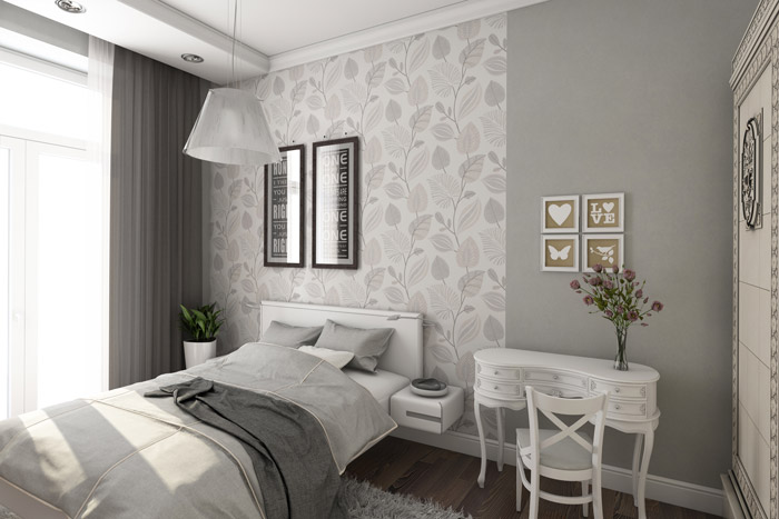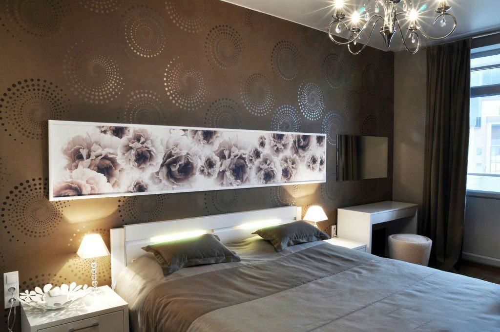 If a bright ornament or, for example, large flowers is what you think is stylish and ideally suits your idea of a cozy bedroom, you can decorate the wall above the headboard with such wallpaper. It will not distract from falling asleep, and will not turn a room into a dazzling field. One accent wall is enough.