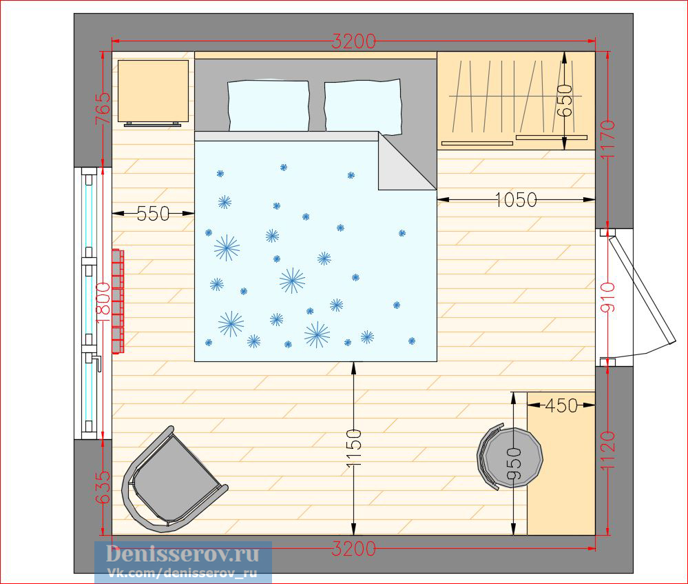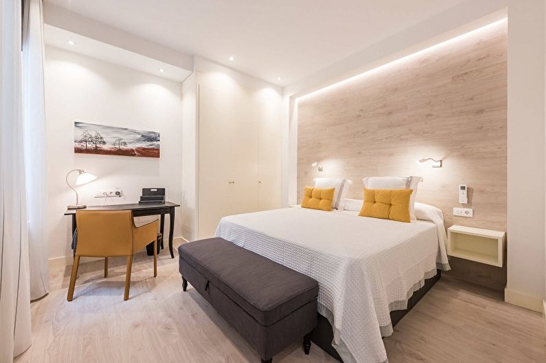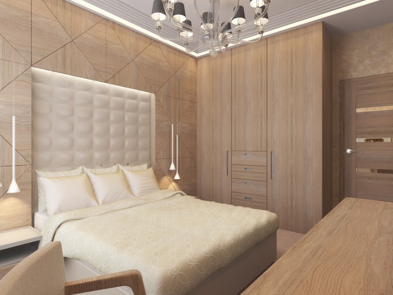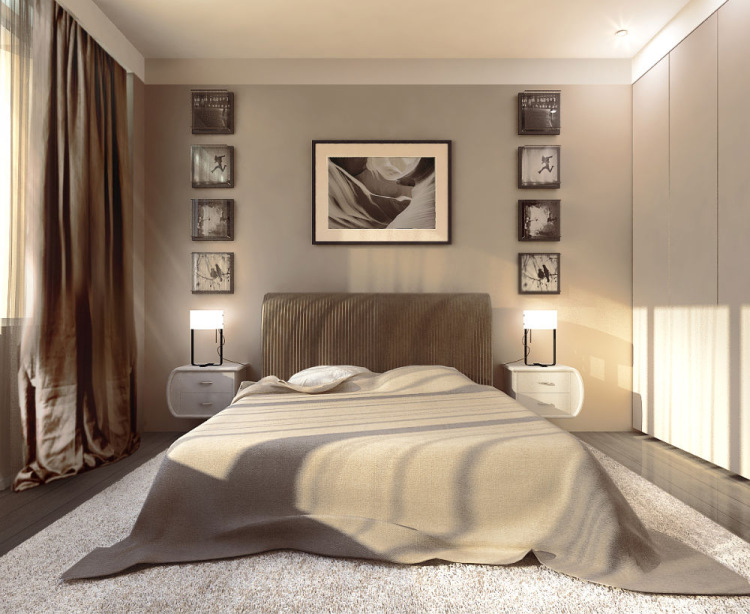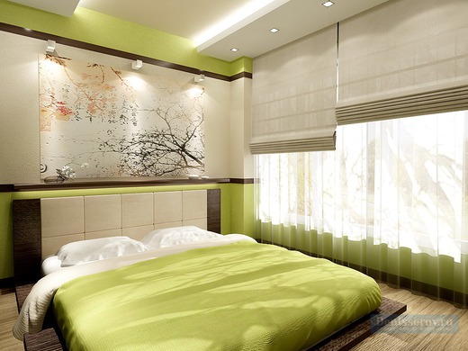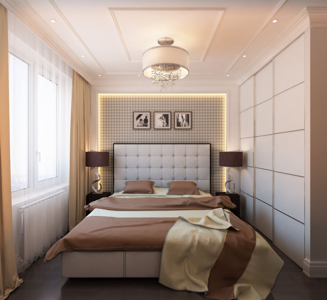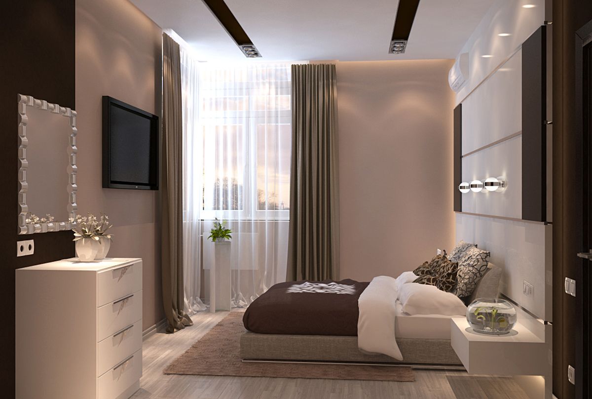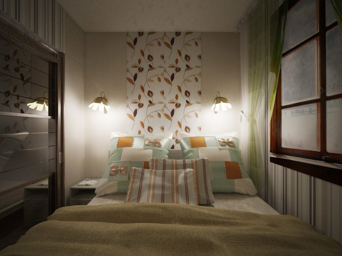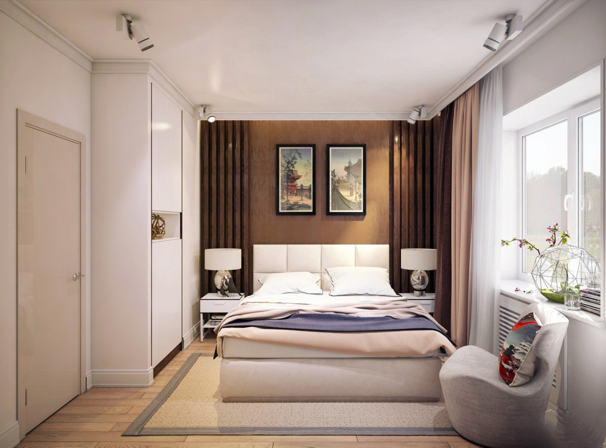 The bed is usually placed head to the wall. But if it is double, then on both sides there should be approx. 0.7 m. Placing the bed close to the window or opposite the entrance is not advisable. Wardrobe advised to put tightly to the wall (not only to the one in which there is a window). The best option is against the light or perpendicular to it.
