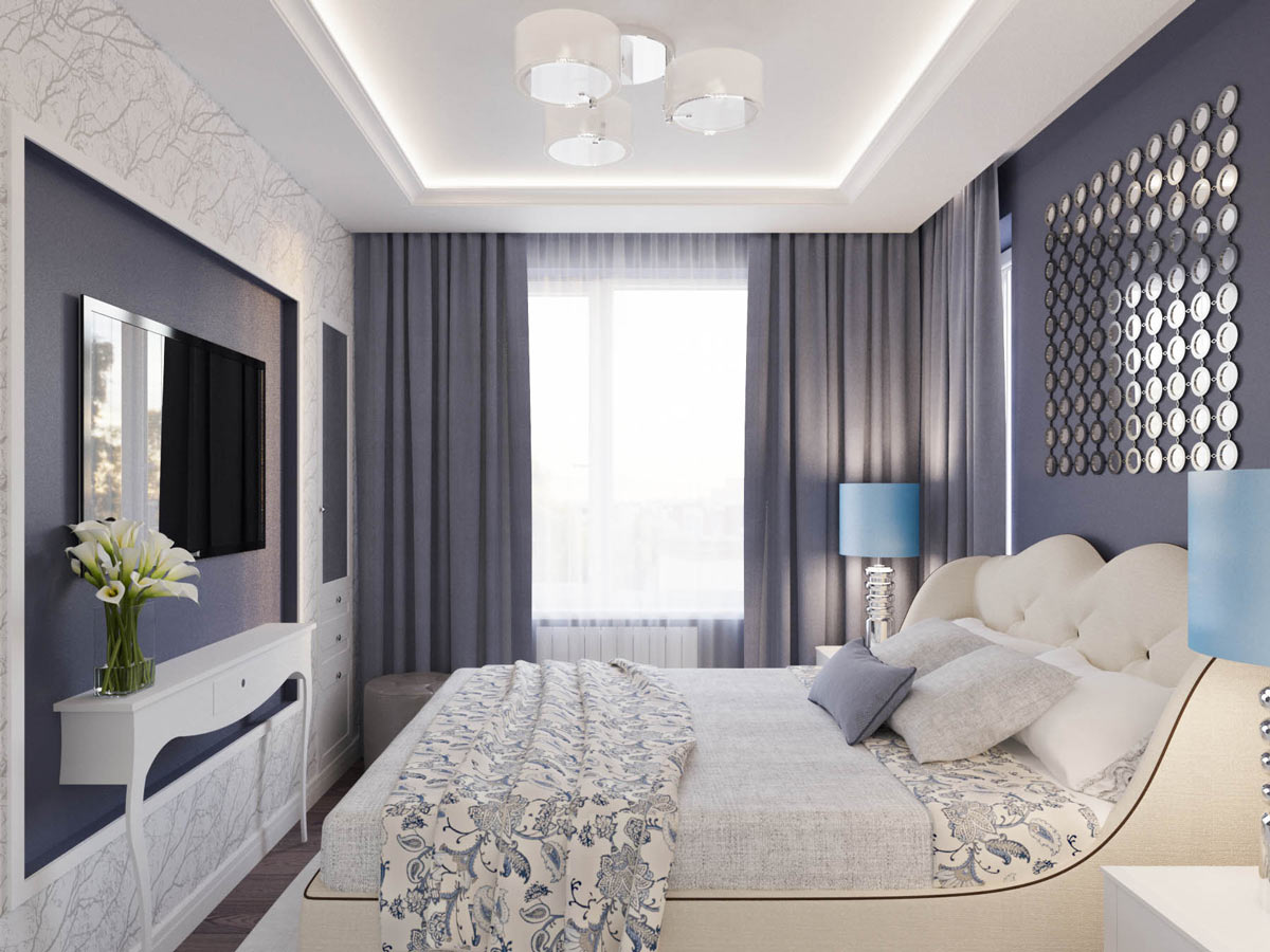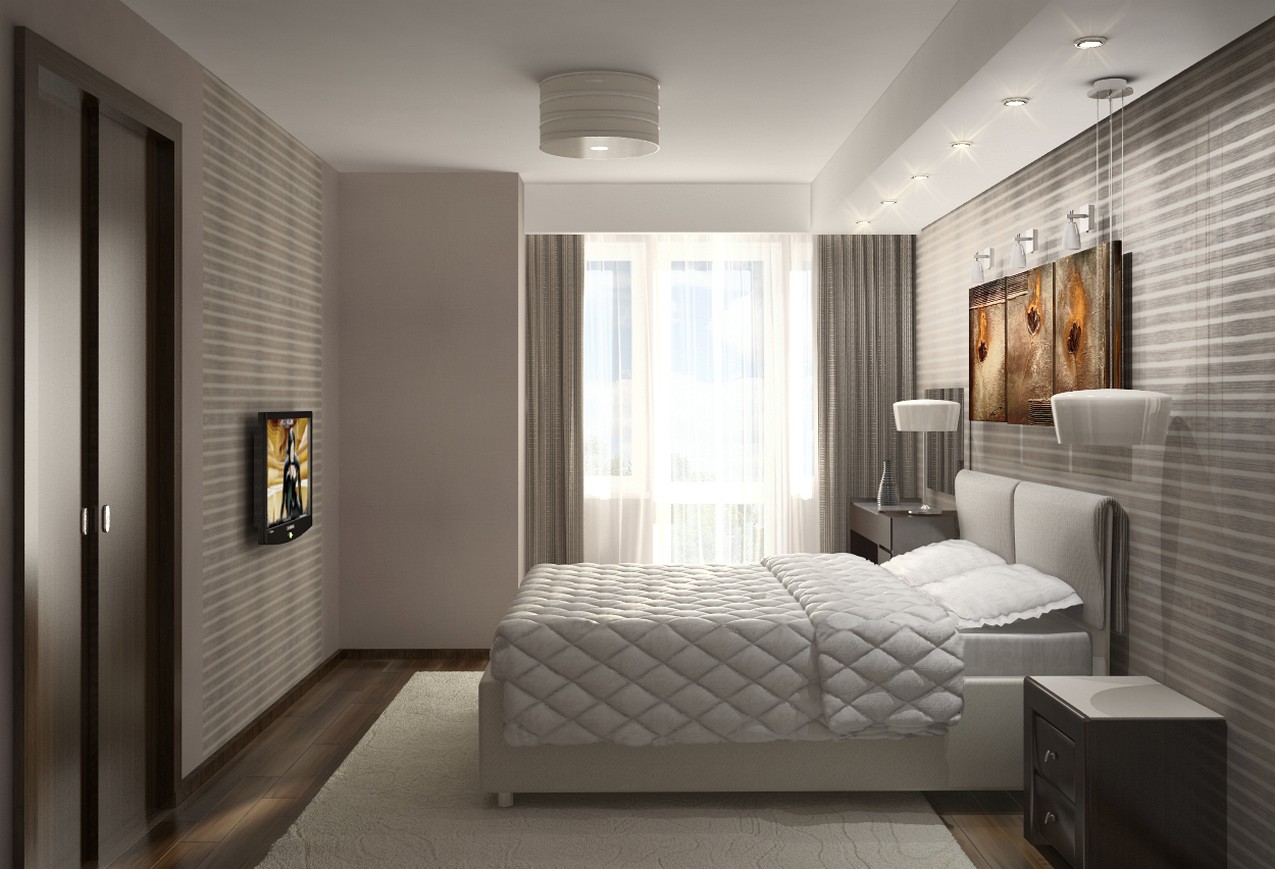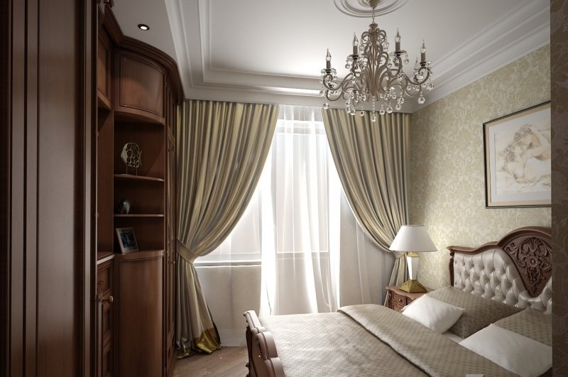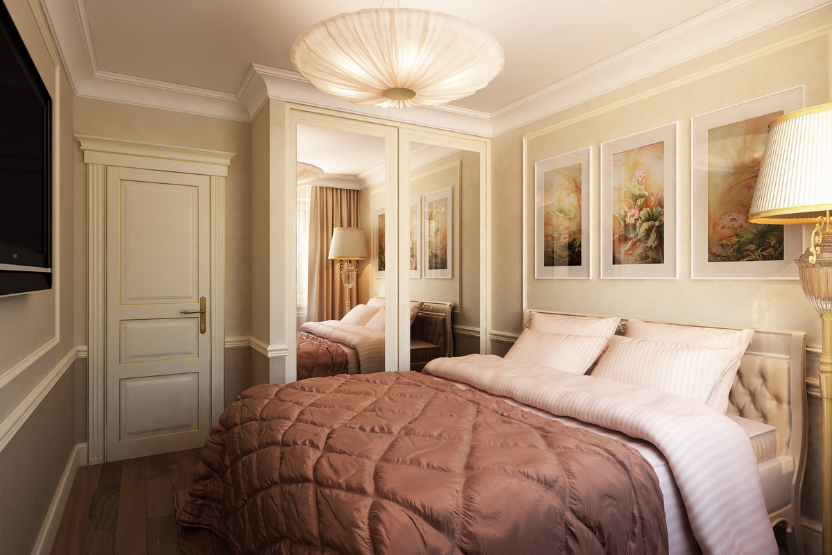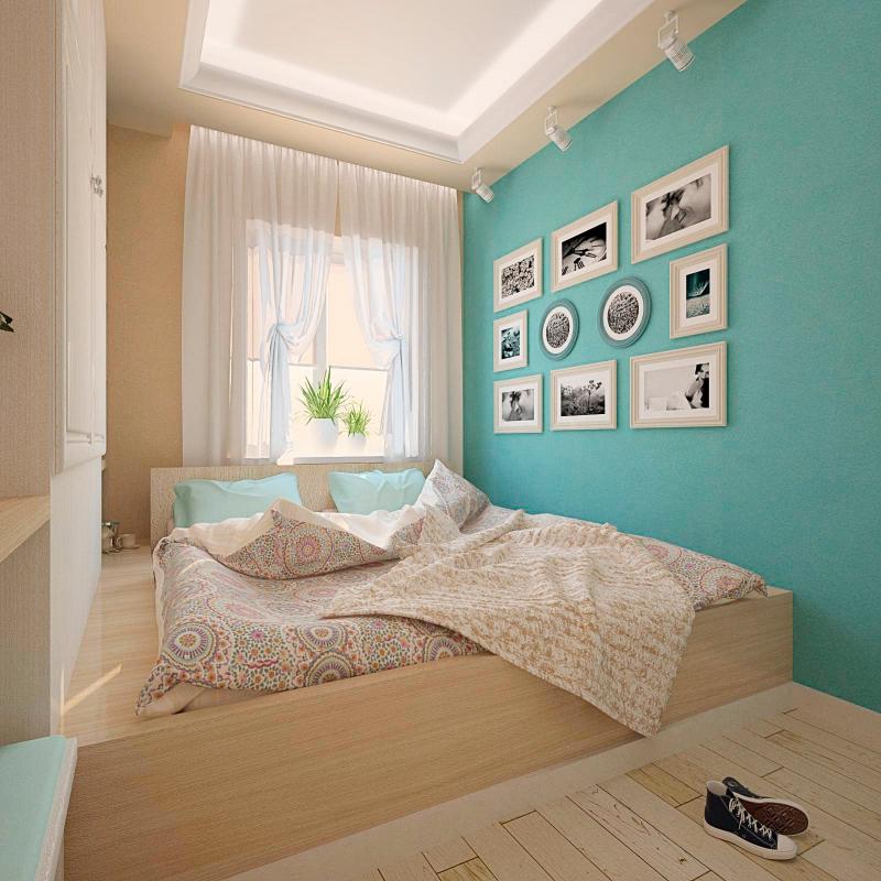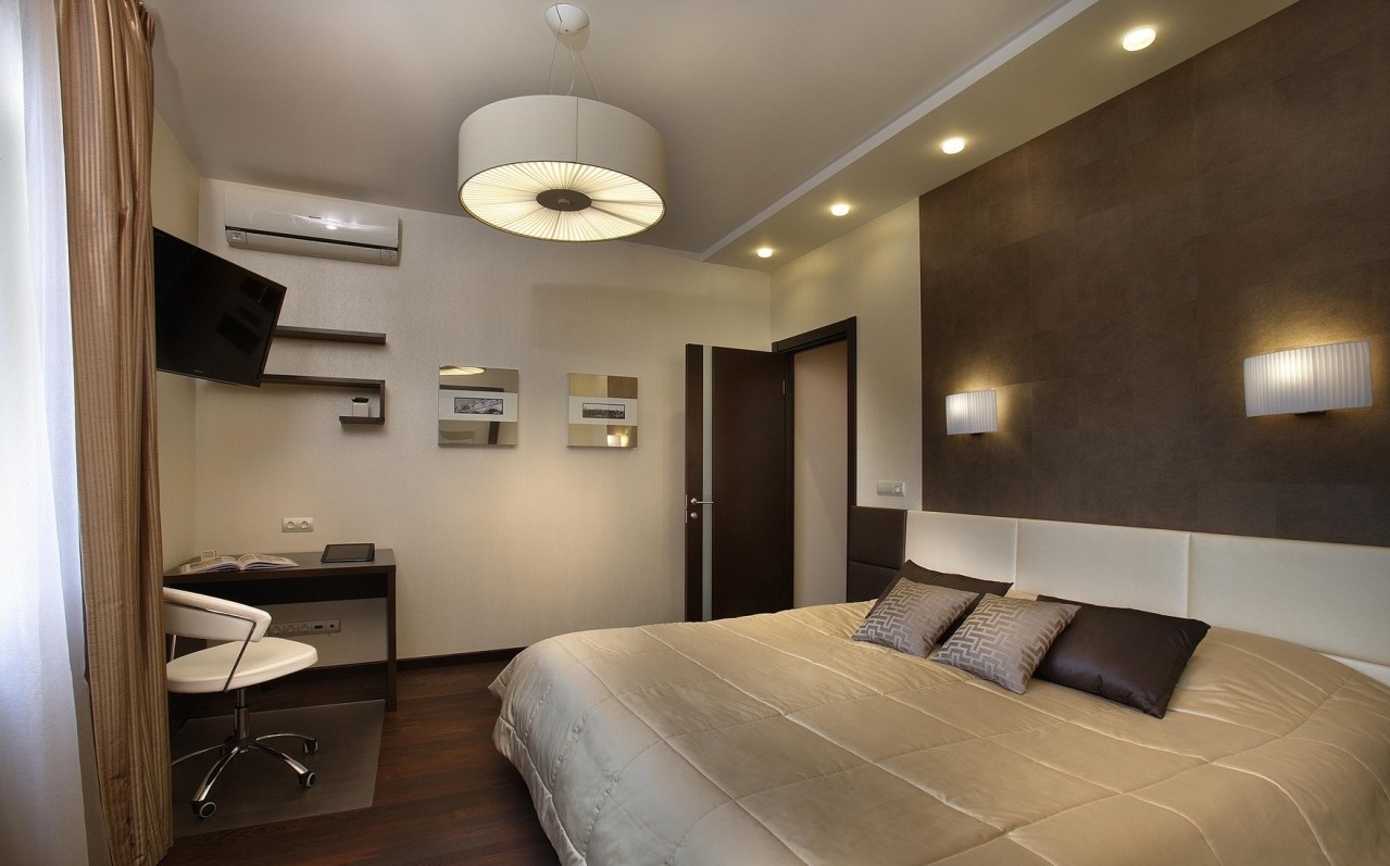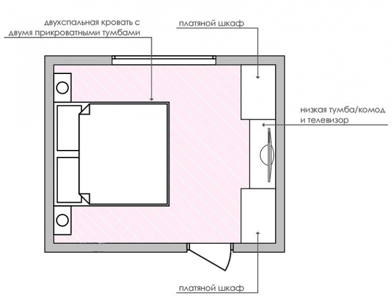 The bed is usually placed head to the wall. But if it is double, then on both sides there should be approx. 0.7 m. Placing the bed close to the window or opposite the entrance is not advisable. Wardrobe advised to put tightly to the wall (not only to the one in which there is a window). The best option is against the light or perpendicular to it.