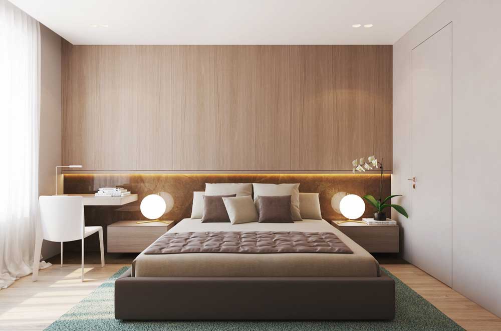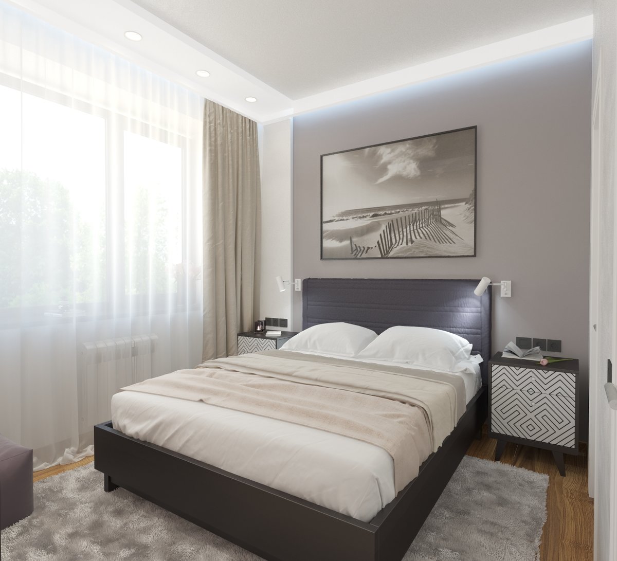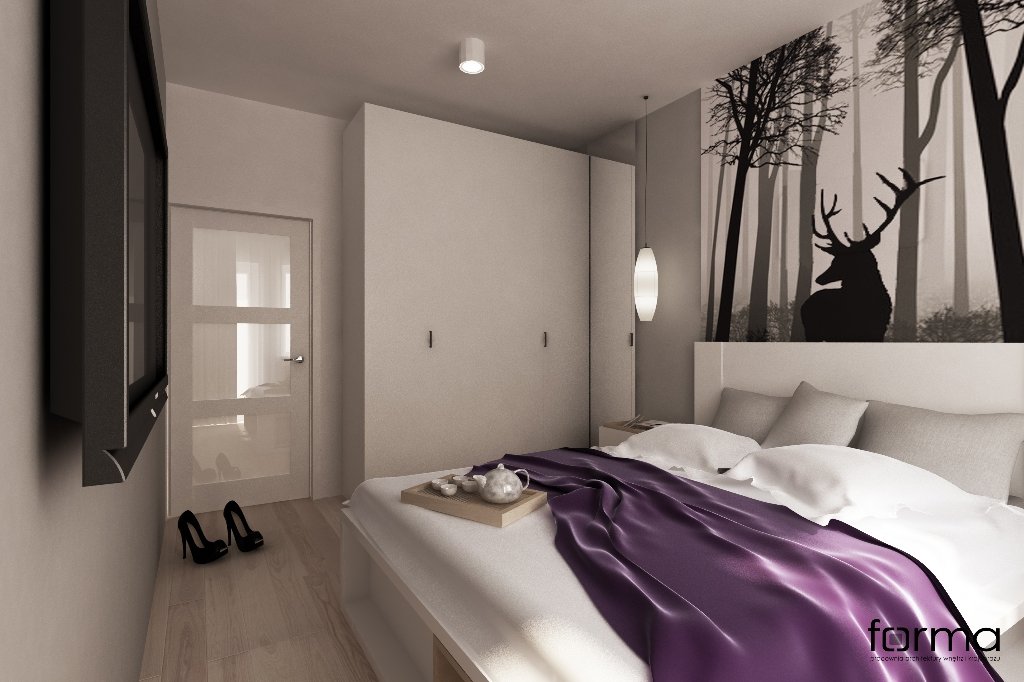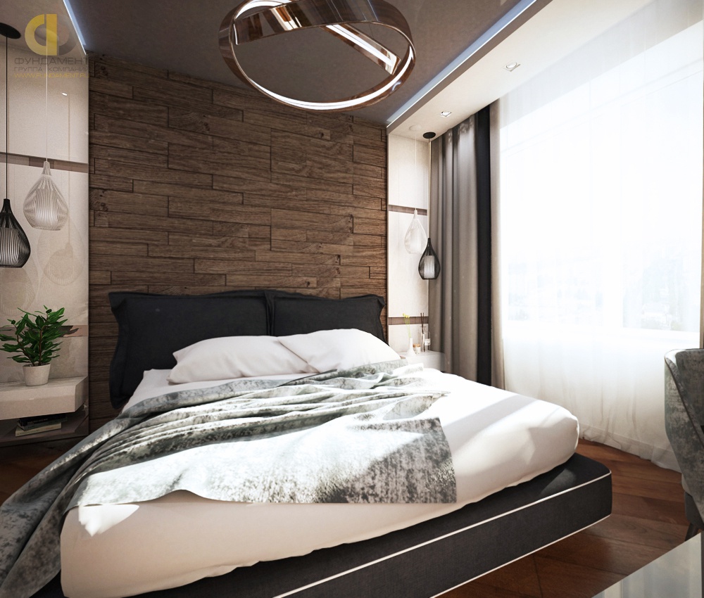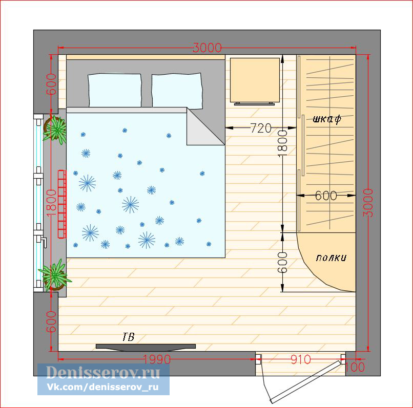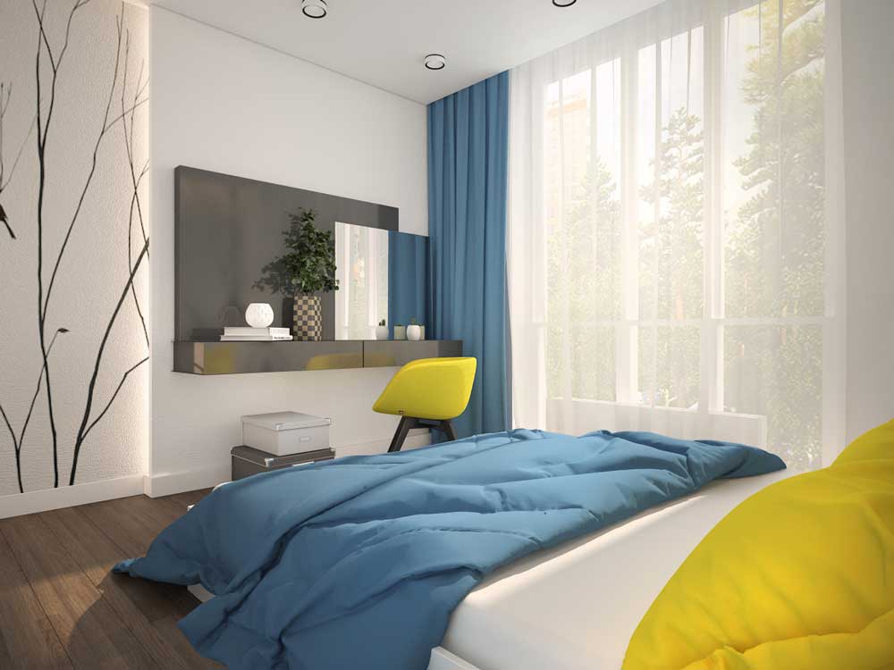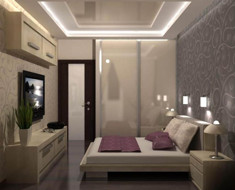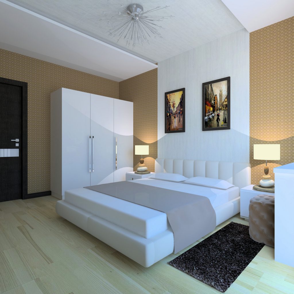 The bed is usually placed head to the wall. But if it is double, then on both sides there should be approx. 0.7 m. Placing the bed close to the window or opposite the entrance is not advisable. Wardrobe advised to put tightly to the wall (not only to the one in which there is a window). The best option is against the light or perpendicular to it.
